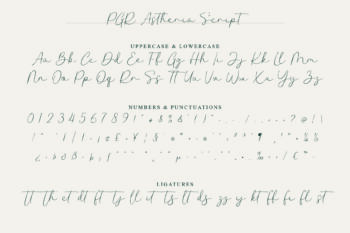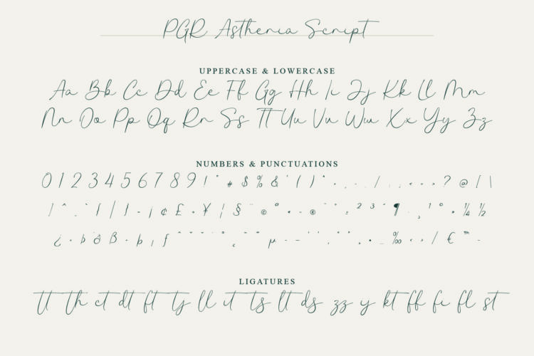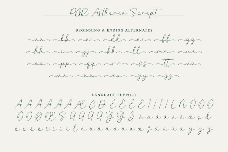 PGR Astheria Script, the script font, is graceful and flowing. It includes a full alphabet, numbers, symbols, ligatures, alternate lowercase letters, and language support. This font adds a soft, personal touch. It is perfect for logos, invitations, signatures, and playful or feminine branding.