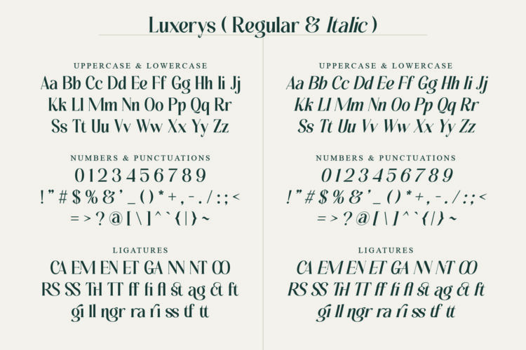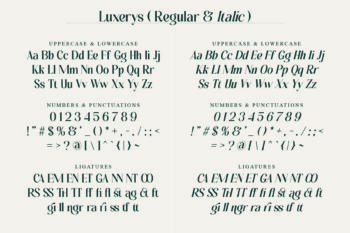 Luxerys, the serif font, is elegant with stylish curves. It has a full alphabet, numbers, basic symbols, and a matching italic style. Luxerys works well for headlines, branding, editorials, and projects that need a sophisticated look.