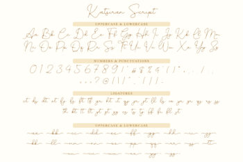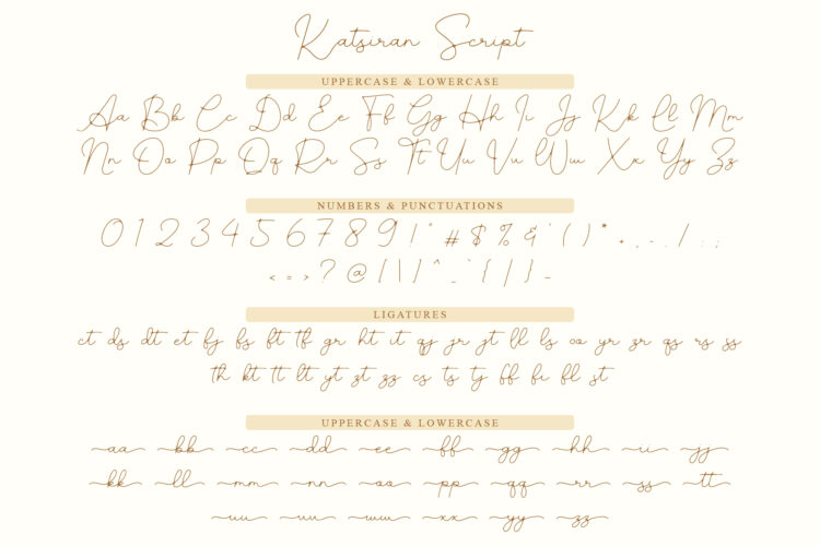 Katsiran, the script font, is elegant and flowing. It has a full alphabet, numbers, basic symbols, ligatures, and alternate lowercase letters for stylish beginnings and endings. Katsiran adds a soft, romantic accent. Use it for logos, signatures, wedding details, and feminine branding.