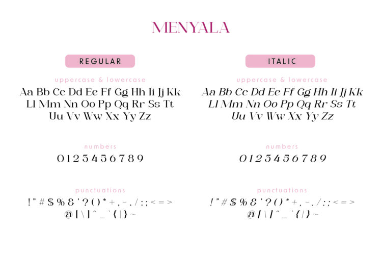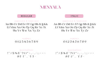 Menyala, the serif font, is thin, feminine, and elegant. It has a full alphabet, numbers, and basic symbols. Menyala is perfect for headlines, branding, editorials, and projects that need a subtle, elegant touch.