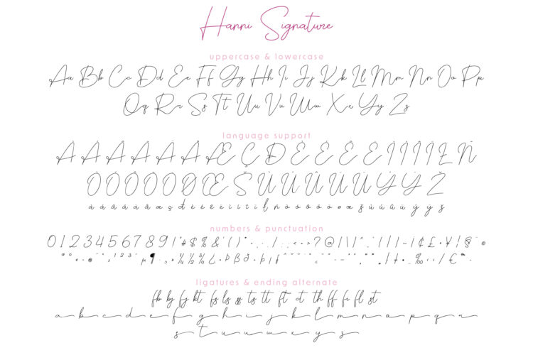 Hanni Signature, the script font, is graceful and flowing. It includes a full alphabet, numbers, symbols, ligatures, and alternate lowercase letters for stylish endings. It also supports multiple languages. Hanni Signature adds a soft, personal accent. Use it for logos, signatures, wedding invitations, packaging, and minimalist branding.