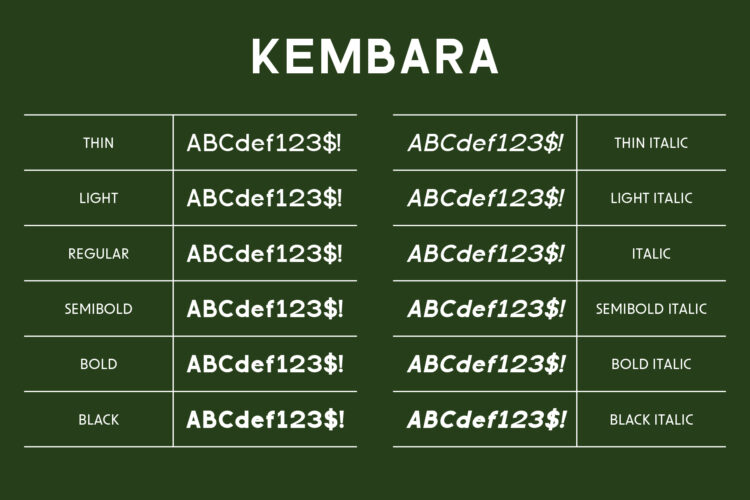 Kembara Font comes with 6 weights and includes with matching italic