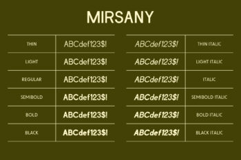 Mirsany is available in TTF, OTF, and WOFF file formats, ensuring compatibility with a wide range of devices and design platforms. Easy to install and use, Mirsany is an excellent choice for both professional designers and beginners. Enhance your design projects with the modern elegance and readability of Mirsany.