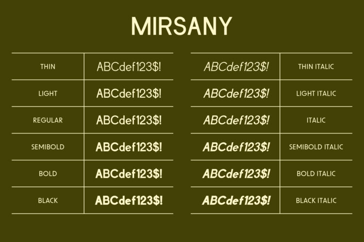 Introducing Mirsany, a modern sans serif font family designed for readability and versatility. Available in multiple weights and accompanied by an italic style, Mirsany is perfect for both headings and body text. Whether you’re creating posters, quotes, blogs, or other projects, Mirsany provides a clean and professional look. This font family includes uppercase and lowercase letters, numbers, and basic punctuation, all with an italic style for added flexibility.