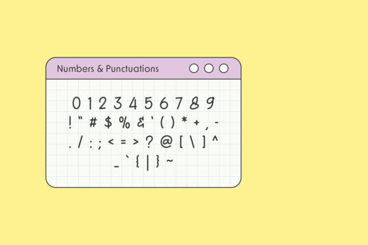 The font includes uppercase and lowercase letters, numbers, and a set of basic symbols. This gives you everything you need to create a complete and colorful layout.